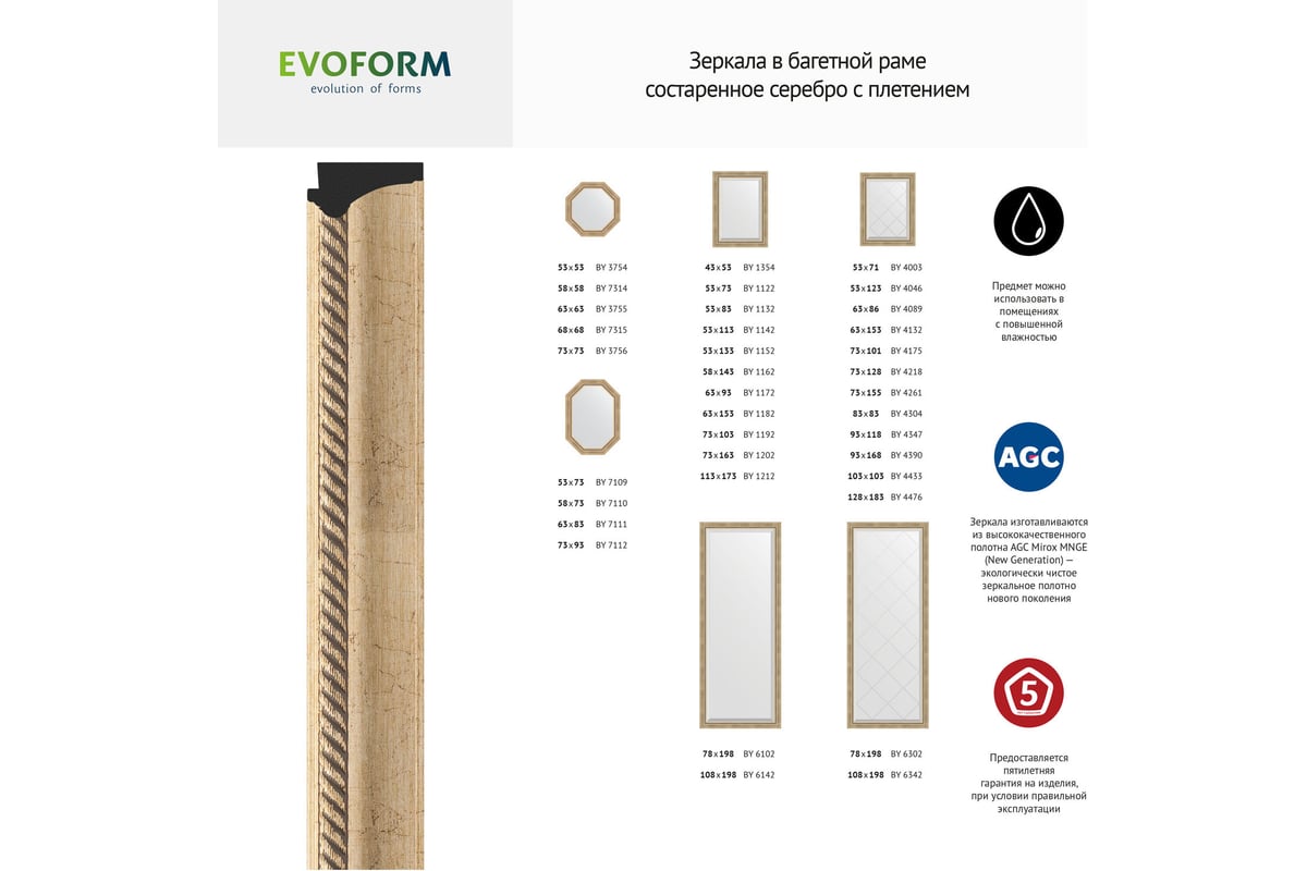 Зеркало в багетной раме EVOFORM состаренное серебро, с плетением 70 мм, 58x58 см BY 7314 изготовлено из высококачественного полотна AGC Mirox MNGE (New Generation) — экологически чистого зеркального полотна нового поколения.