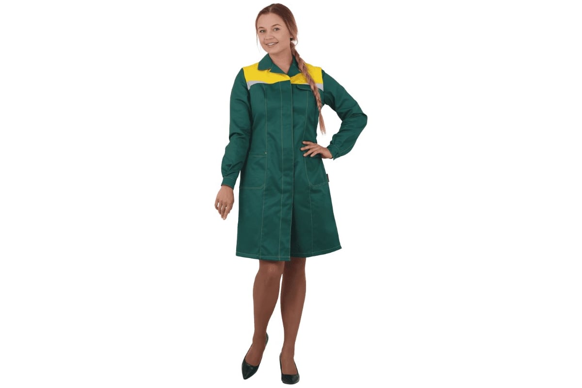 Женский халат ГК Спецобъединение КМ-10 ЛЮКС зеленый-жёлтый Хал 742/ 80/170 предназначен для сотрудников производственных предприятий. Сшит из смесовой ткани с водоотталкивающей пропиткой.