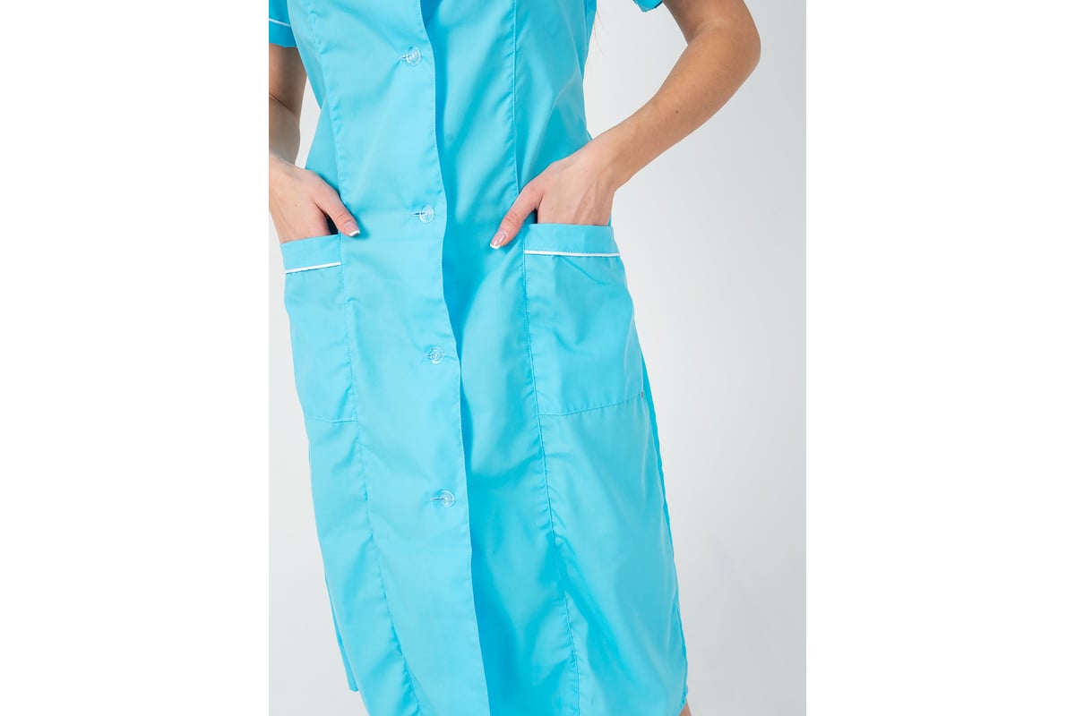 Женский халат ООО ГУП Бисер Классика-Лайт голубой, р. 48-50, рост 170-176 4640100803987 имеет короткий рукав и центральную застежку на пуговицы.