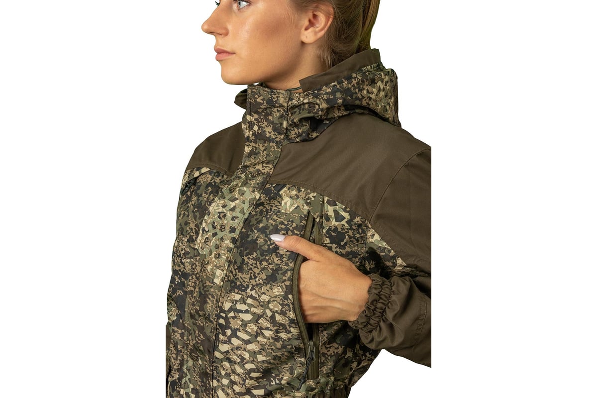 Женский костюм Горка-Осень с флисовым подкладом по функционалу и применяемым материалам сопоставим с мужским аналогом. За счет ткани дуплекс костюм легкий и при этом сохраняющий высокие дышащие свойства.