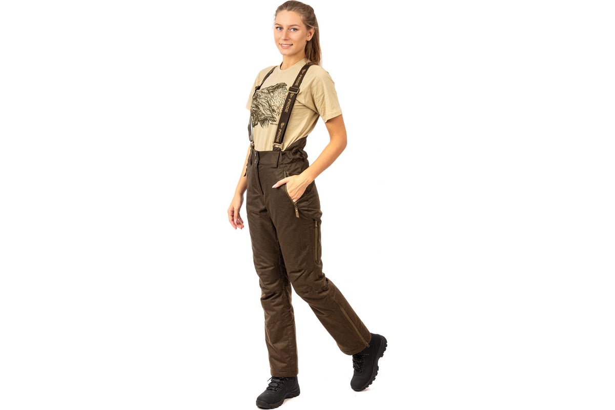 Женский костюм Pride Artemida Артемида, Бавария, коричневый, р-р 40-42 рост 170-176 4610097029745 состоит из куртки удлинённого кроя и брюк с завышенной спинкой и подтяжками. Ткань не пропускает воду от дождя или мокрого снега. Утеплитель компактный и лёгкий. Костюм хорошо сидит, движения не сковываются.