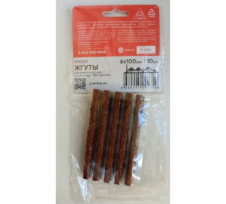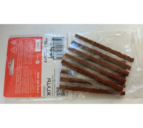 Жгуты для ремонта б/к шин, 6x100мм, 10 шт., коричневые, ПВХ подложка, в пакете AIRLINE ATRS227 Жгуты из бутилкаучука используются для заделывания проколов в шинах авто- и мототехники. Благодаря армированию нейлоновым кордом удалось добиться лучших показателей по долговечности и износостойкости