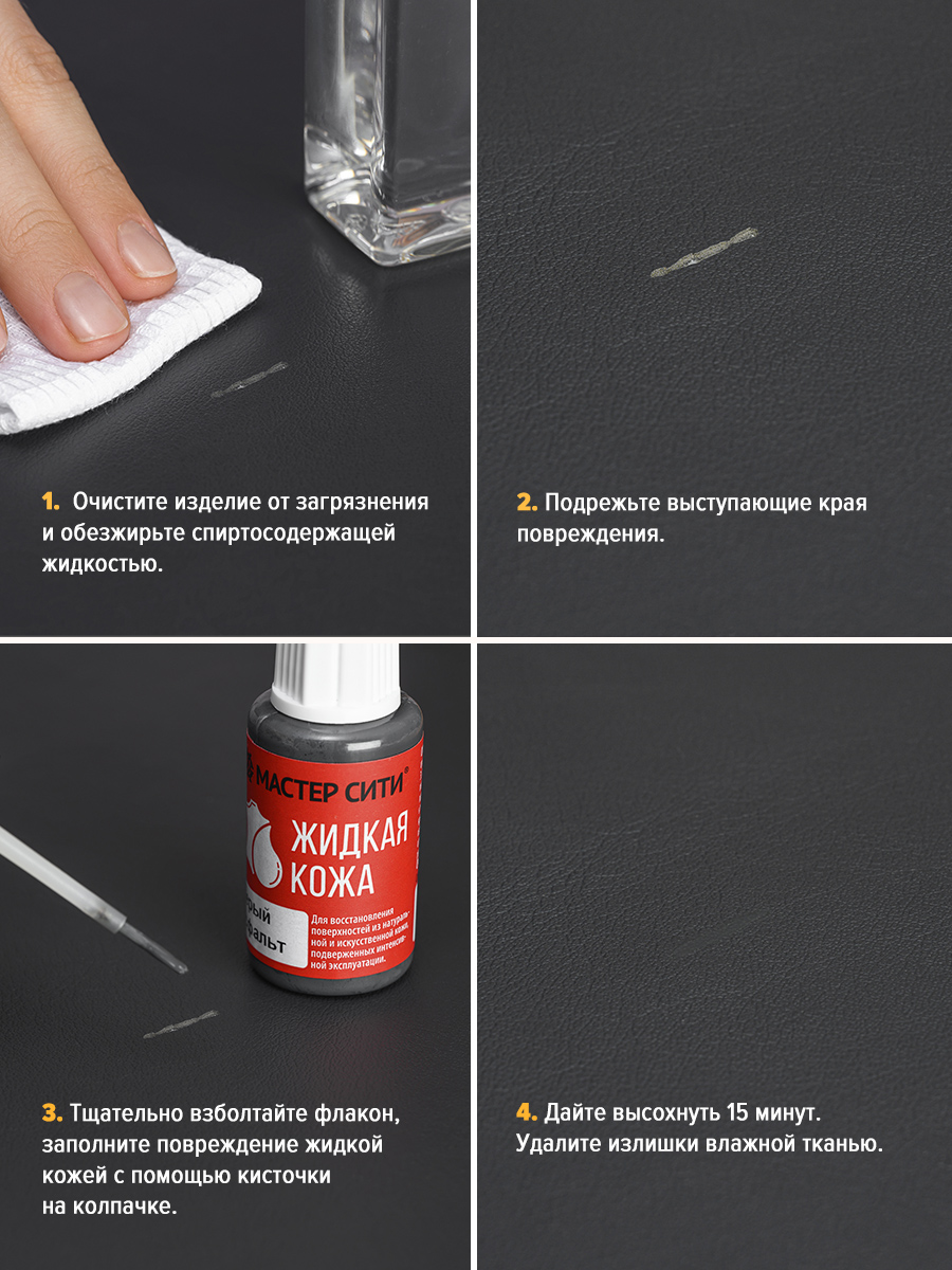 Жидкая кожа для мебели, ремонта и восстановления кожаных вещей из гладкой натуральной, искусственной (кожзам) и экокожи (кроме замши и нубука). Применяйте кожу для ремонта порезов, царапин, потертостей на мебели, обуви, сумках, салоне автомобиля и аксессуарах. Жидкая кожа для обуви, мебели, авто — это специализированный густой, клейкий состав, который заполняет повреждение и выравнивает поверхность в цвет изделия. Кожа жидкая или восстановитель кожи образует прочное эластичное полуглянцевое покрытие, стойкое к перепадам температур, влаге, выцветанию и динамическим нагрузкам. После ремонта участок устойчив к воде, не окрашивает, не отслаивается. Сочетается с краской для кожи. Можно смешивать Жидкую кожу Мастер Сити нескольких цветов между собой для получения нужного оттенка. Следуйте инструкции на упаковке. Обратите внимание, что экран может искажать цвет продукта. Проверяйте цвет на экранах 2х устройств.