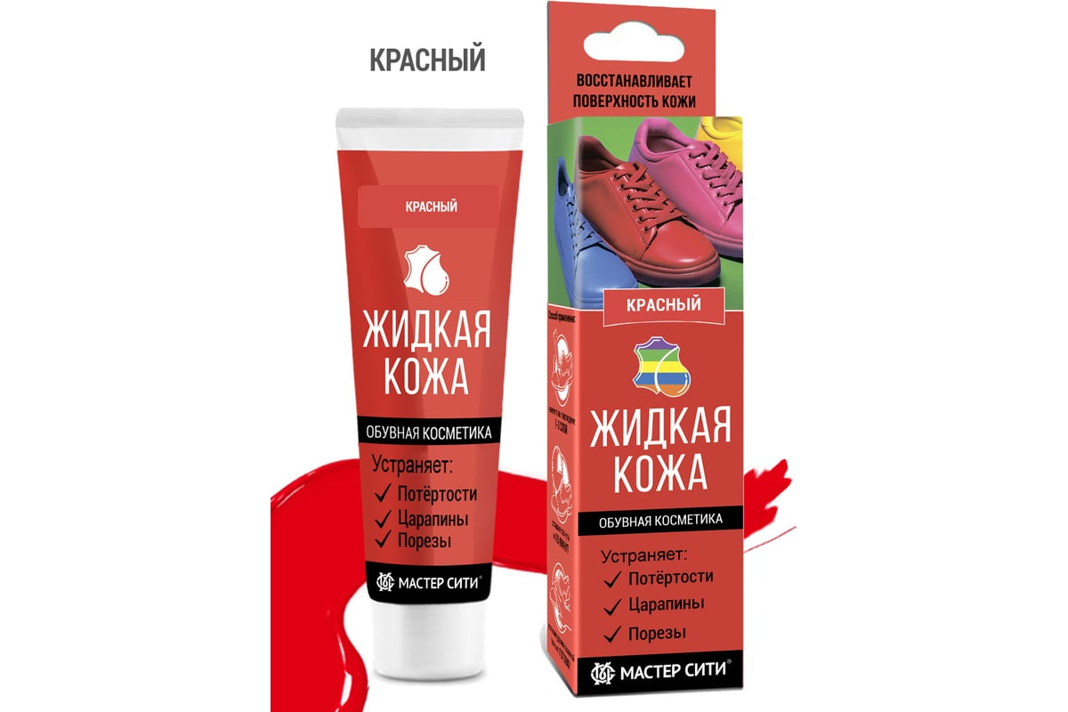 Жидкая кожа для обуви, ремонта изделий из кожи от производителя Мастер Сити. С помощью средства для ремонта кожи вы сможете в домашних условиях отремонтировать повреждения на изделиях из гладкой натуральной, искусственной кожи и экокожи (кожзама). Применяйте восстановитель кожи для ремонта порезов, царапин, потертостей на мебели, обуви, сумках, для кожаного салона авто и аксессуаров. Густой кремообразный состав кожи на основе силикона и натуральных восков заполняет, склеивает поврежденный слой кожи в цвет изделия и выравнивает поверхность. Восстановитель кожи не растягивается, не выцветает, устойчив к перепадам температур, водостойкий. Сочетается с краской для кожи. Можно использовать вместо краски для обуви. Жидкая кожа для мебели представлена в 40 цветах, можно смешивать между собой для получения нужного оттенка. Место ремонта не впитывает воду, покрытие не отслаивается. Обратите внимание, что экран может искажать цвет продукта. Проверяйте цвет на экранах 2х устройств.