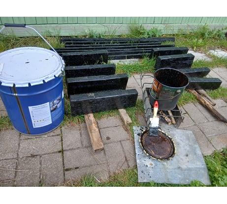Хорошо ложится на материал когда хотя бы немного прогреешь. Прогреваю в жестяной банке меньшего объёма Не надо долго греть всё ведро. Для этого соорудил что-то типа мангала. Становится жидкой как обычная краска и легко с ней работать кистью, затекает во все поры и тонкий слой быстро сохнет за 24 ч. и расход мастики становится небольшой.Хорошо защищает от влаги деревянные детали.