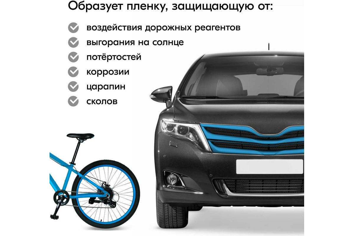 Жидкая резина KUDO голубая KU-5505 - современное многофункциональное легкоудаляемое резиновое покрытие KUDO® COLOR FLEX для защиты и придания индивидуальности внешнему виду любых деталей экстерьера автомобилей, мото-, вело- и другой техники. Легко снимается и не оставляет следов. После полного высыхания образует эластичную пленку, которая защищает ЛКП от сколов, царапин, коррозии, потертостей, выгорания и воздействия дорожных реагентов. Сохраняет свои защитные и декоративные свойства при любых погодных условиях. Обладает бархатистой резиновой фактурой.