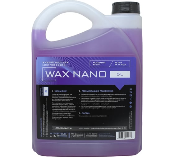 Wax Nano: Экспресс воск для заключительной обработки и придания гидрофобного эффекта для лакокрасочных и резиновых поверхностей автомобиля. Образует тонкую пленку, которая защищает покрытие от атмосферных осадков, а также препятствует проникновению вредных веществ, находящихся в дорожном покрытии. Обладает антистатическим, водоотталкивающим эффектом. Освежает цвет, придает блеск поверхности.