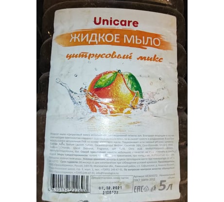 Жидкое мыло для рук UNICARE Цитрусовый микс, ПЭТ, 5 л, Я0000025636