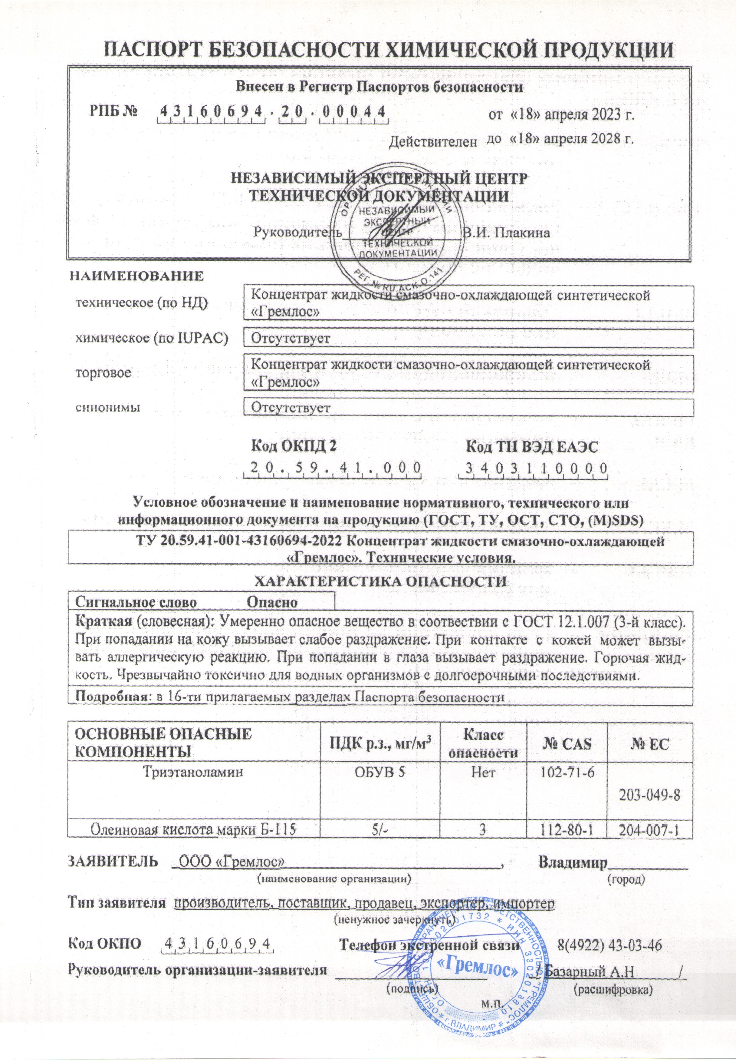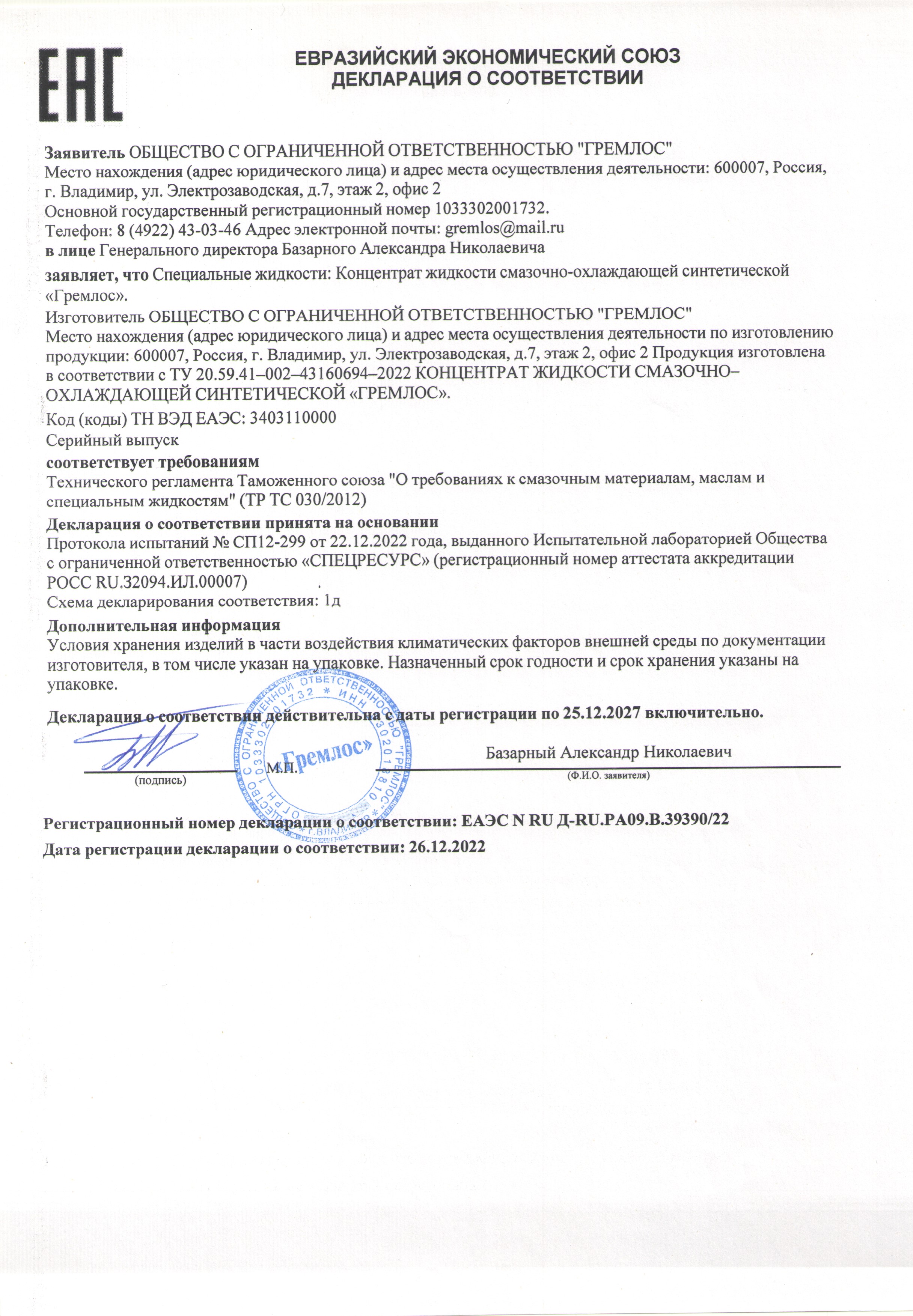 Технические характеристики смазочно-охлаждающей жидкости Гремлос 4687201795032