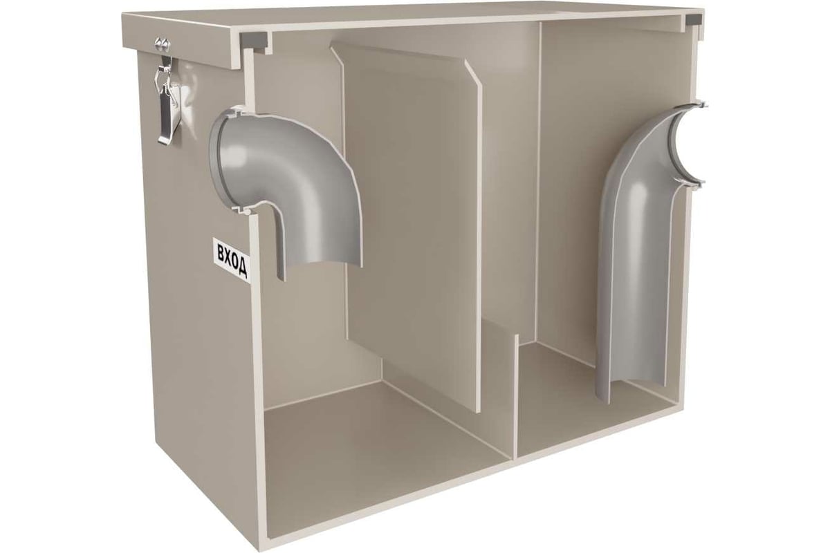 Принцип действия основан на разделении: вода с жировыми загрязнениями поступает внутрь, где жир оседает в специальных камерах, а очищенная вода отводится в канализацию. Устройство оснащено герметичной крышкой с резиновым уплотнителем и защёлками, предотвращающими выход запахов наружу.