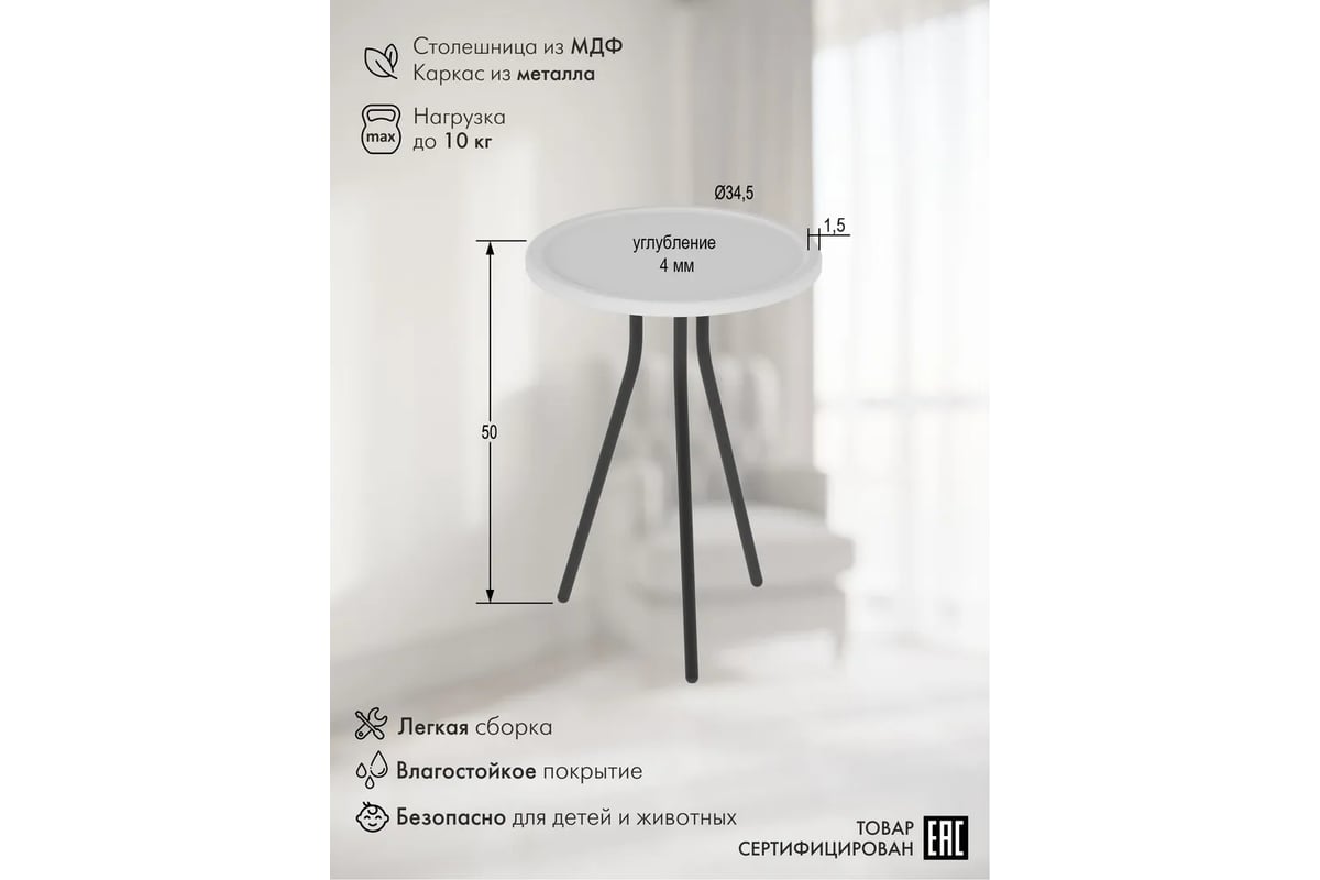 Журнальный столик «Фостер» на облегченных металлических ножках является ярким представителем минималистического стиля и достойно дополнит интерьер гостиной или прихожей. Столик отличается сдержанной формой и легким исполнением. Круглая столешница с мягким углублением в классических декорах красиво перекликается с холодной строгостью металла. Лаконичная модель станет функциональным украшением интерьера в современном стиле. Продукция поставляется в разобранном виде, упакованная в гофрокартон. В комплект входит вся необходимая фурнитура и удобная инструкция для сборки. Использует экологичный материал МДФ (19 мм). Влагостойкое декоративное покрытие. Столешница с невысоким бортиком, углубление 4 мм. Лаконичный дизайн. Закругленные защитные подпятники. Диаметр столешницы 345 мм. Максимальная нагрузка до 10 кг.