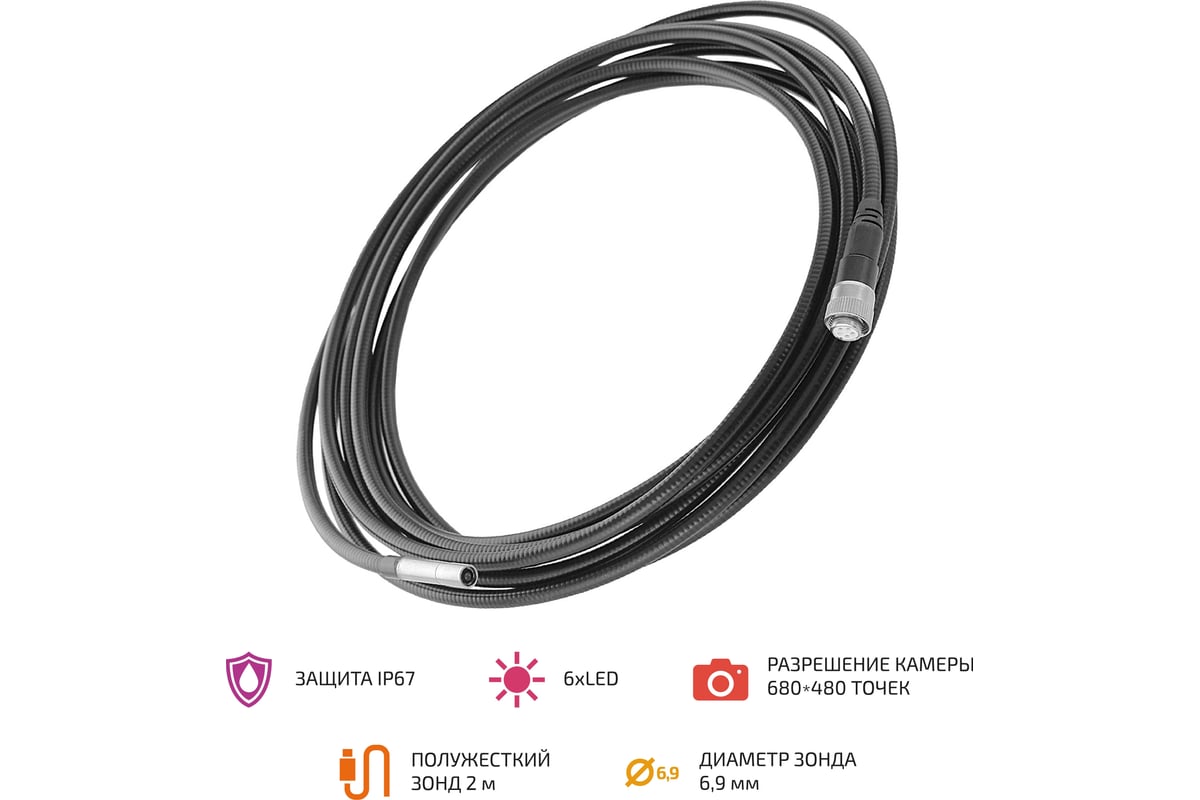 Зонд двухметровый купил к видеоскопу. Зонд изготовлен из качественного материала, надежный. Изображение отличное у камеры. Очень доволен покупкой. Рекомендую.