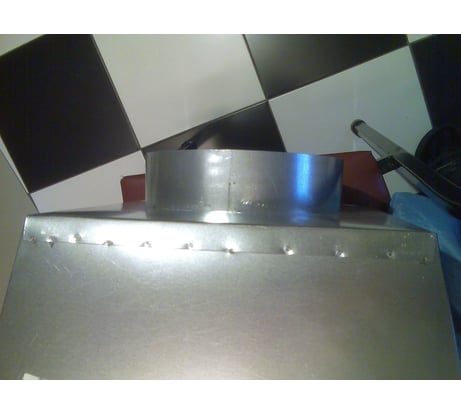 Спроектирован и изготовлен грамотно, понравился. Изготовитель молодец- простенько и по делу. Легкий- и это плюс. Геометрия ровная, собран на точке, фланец- зачеканкой. По углам закладные под болт 8. Длина патрубка 50. Размер зонта по нутру 400, по фланцу 440. Металл 0.4 или 0.5, угольники 1.5. Заусенцы есть, но немного и не по наружному габариту. Такого, чтоб руки сразу порезать нету. Для себя чуть подчищал, для промразмещения можно и не обрабатывать.