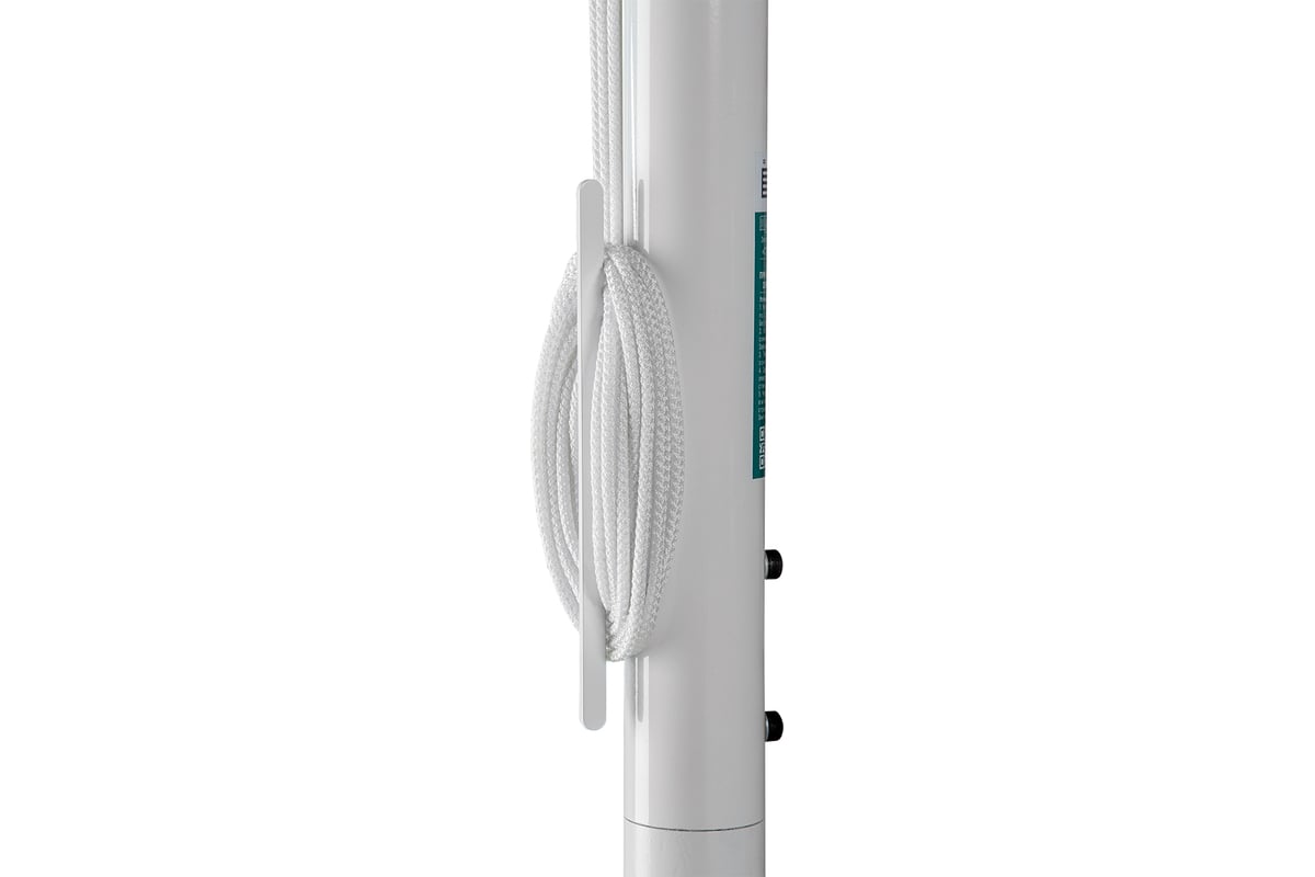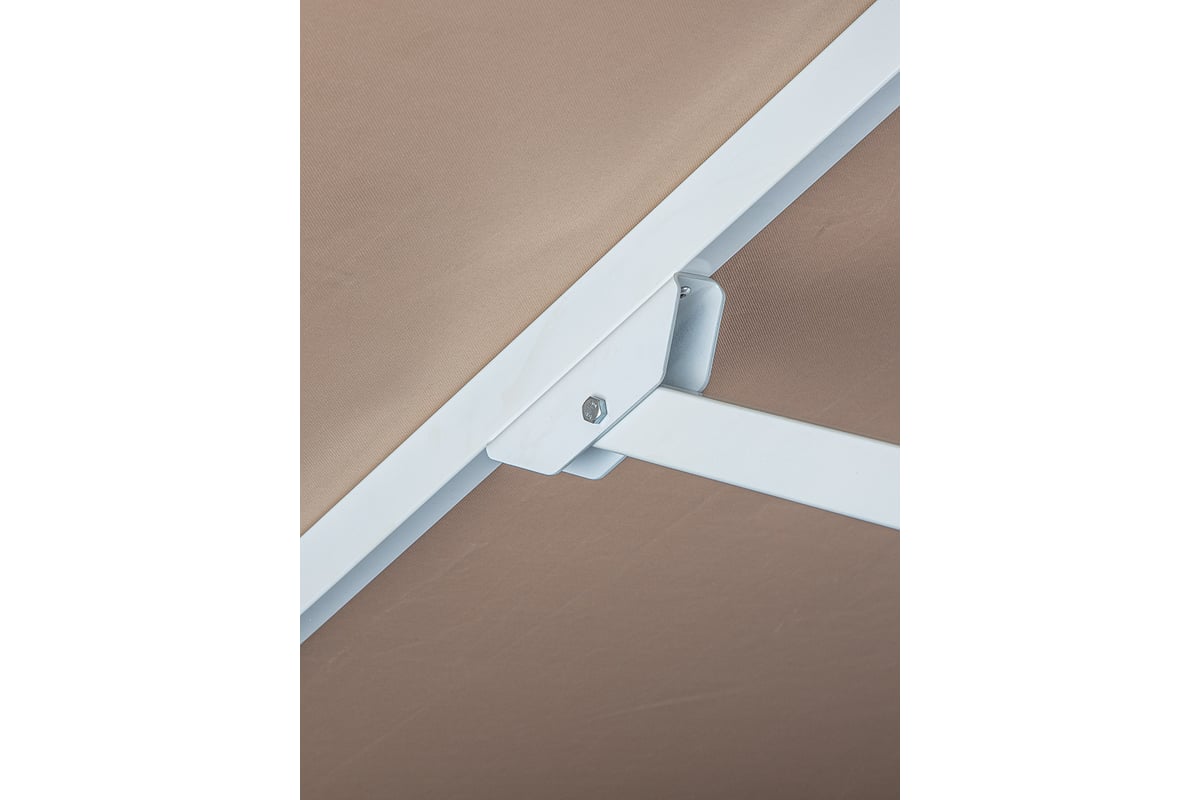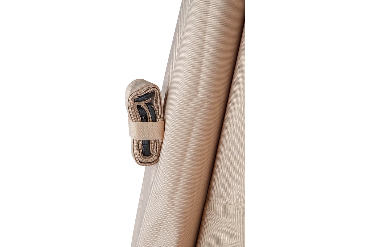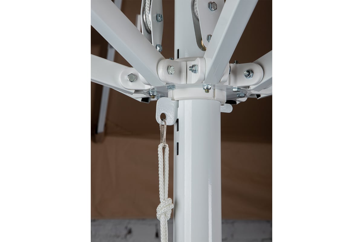 Зонт рассчитан на ветровую нагрузку до 10 м/с. Купол поднимается при помощи системы полиспаст 1:3 и натягивается на 8 спиц Все металлические детали покрыты стойкой порошковой краской с технологией предварительного обжига деталей в печи. Купол выполнен из прочного износостойкого материала «Oxford 600».