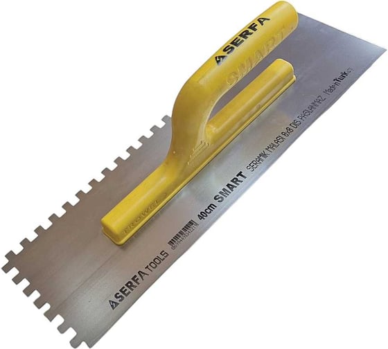 Зубчатая гладилка SERFA SMART с пластиковой ручкой используется для нанесения и разглаживания строительных смесей при ремонтных работах. Функциональная форма гладилки позволяет равномерно распределить смесь по поверхности.