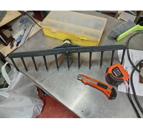 После установки на длинный лёгкий черенок получились хорошие грабли для травы.