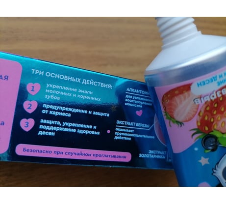 Детская зубная паста содержит комплекс природных компонентов для защиты от микробов и укрепления десен: аллантоин, алоэ вера, экстракт березы, экстракт золотарника