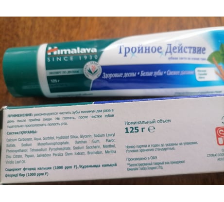 Зубная паста HIMALAYA "Тройное действие" помогает предотвратить воспаление десен, защищает от кариеса, освежает дыхание надолго, сохраняет зубы чистыми и белыми, обладает освежающим вкусом, помогает предотвратить образование зубного налета.