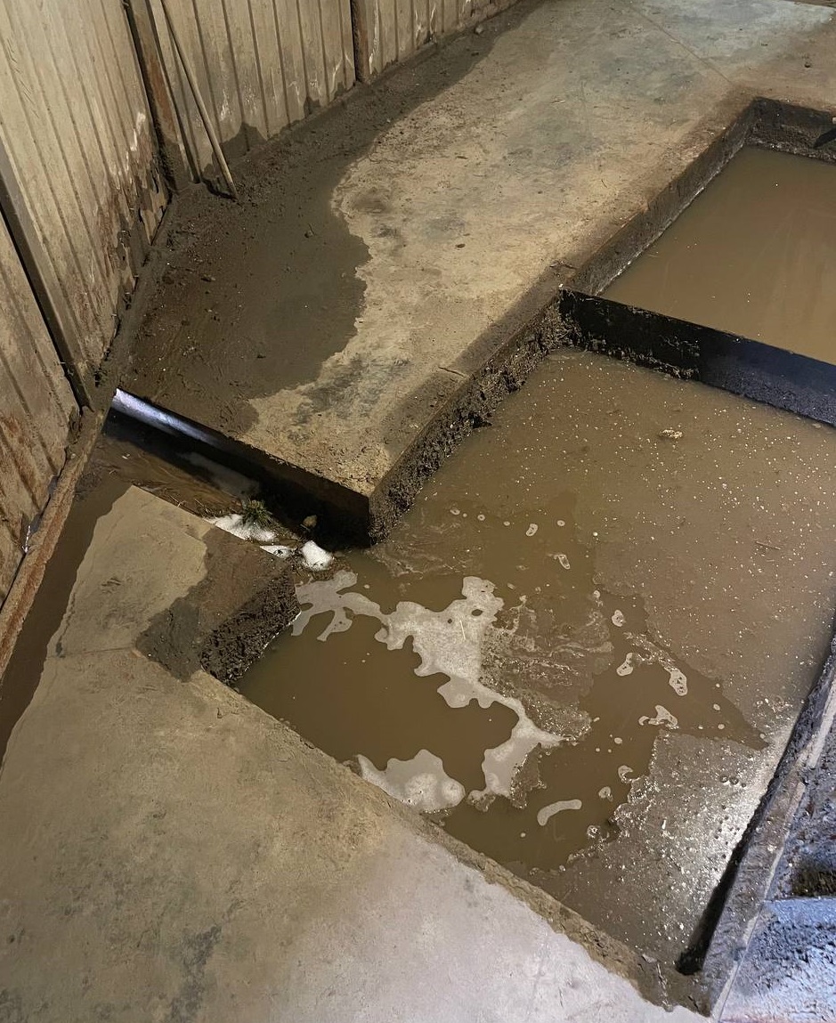 Грязная вода стекает в слив в полу, который проходит через весь пост