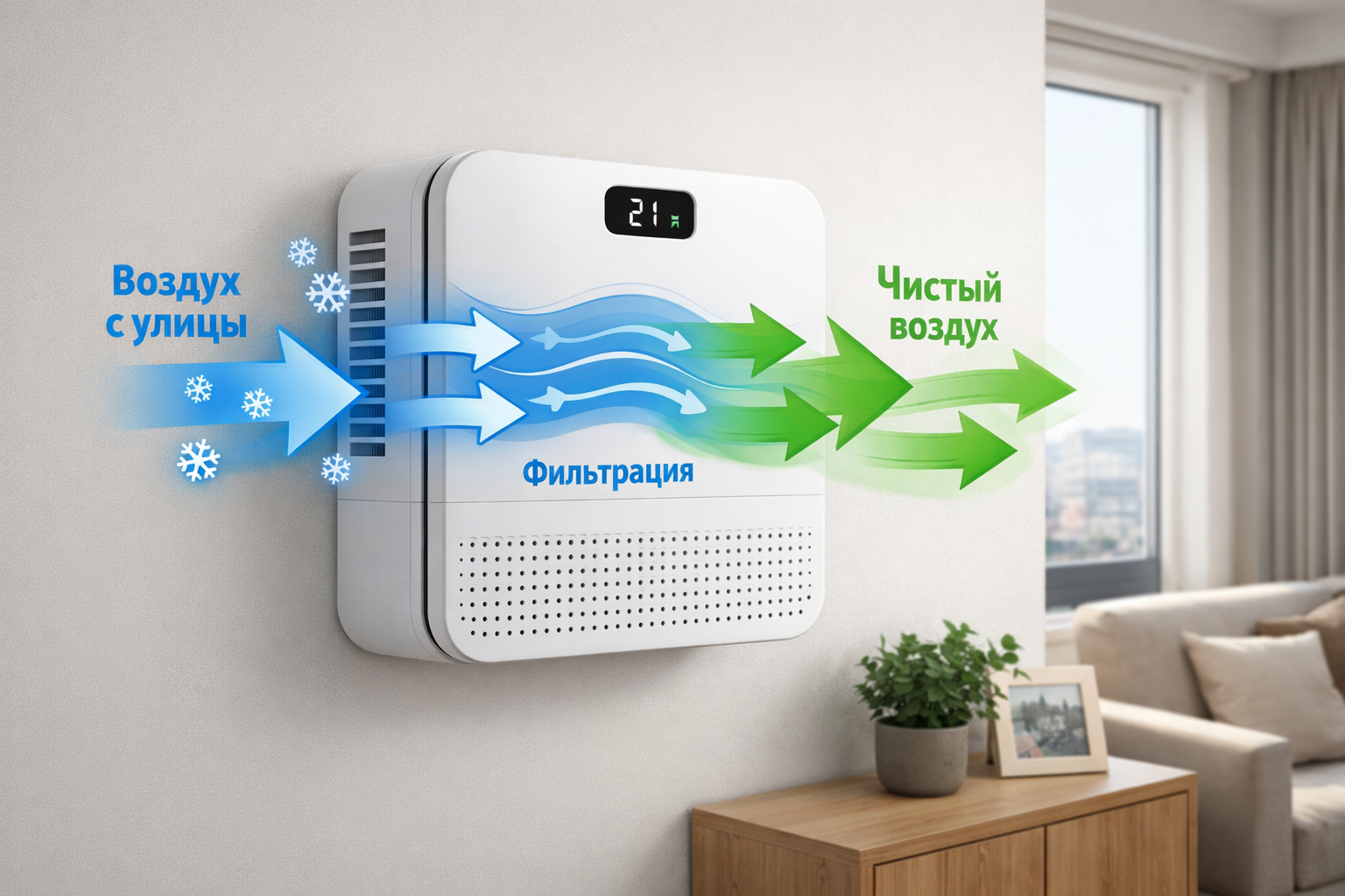 | Что делает | Подает свежий, очищенный и подогретый воздух | Охлаждает или нагревает воздух внутри помещения | Фильтрует воздух внутри помещения | Убирает отработанный воздух из комнаты, нагревая им приточный воздух с улицы |