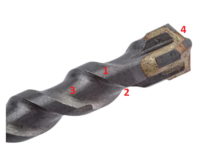 Устройство бура: 1 – спираль; 2 – канал для отвода пыли; 3 – сердцевина; 4 – концевик.