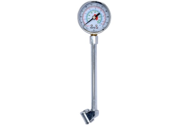 Манометр обеспечивает измерение до 15 атм: его можно использовать для грузовых автомобилей. Корпус прибора выполнен из металла. На циферблате выводятся давление в нескольких единицах измерения: psi, кПа, бар. Рабочая длина устройства составляет 140 мм: с его помощью удобно измерять давление в колесах автомобилей, где мало пространства между диском и кузовом.