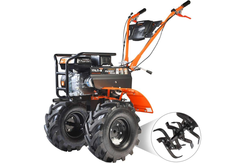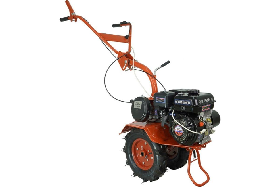 Эта модель подходит для садово-огородных работ, уборки снега, сенокоса, транспортировки грузов. Мотоблок поможет обработать даже тяжелую суглинистую почву. 4 передачи вперед и 2 назад позволяют подобрать нужный темп работы. Четырехтактный бензиновый двигатель с воздушным охлаждением оснащен защитой от перегрева. Присутствует функция разобщения колес, которая пригождается при развороте техники в обратную сторону в условиях ограниченного пространства. Рукоятки руля регулируются независимо друг от друга, что удобно во время нарезания грядок.