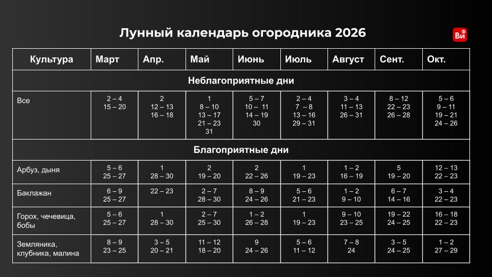 Мы учли фазу Луны, знаки Зодиака и особенности каждой культуры – получился лунный календарь садовода и огородника на 2026 год. Смотрите и скачивайте его по ссылке.
