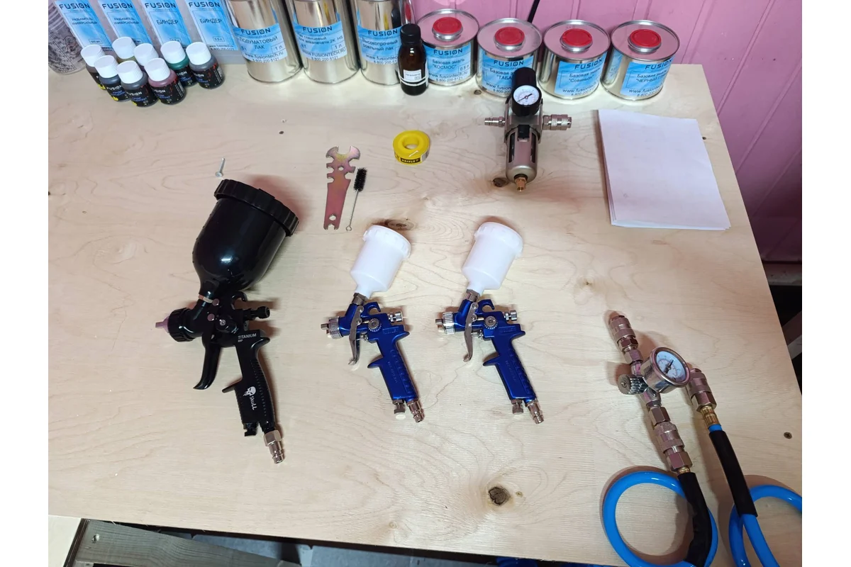 Прикольный пулик, очень сильный закос под Sata. Базу металлик и лак разложил нормально. C учетом того, что краскопульт в руках держу впервые, грунт не стал им пробовать. Cвоих денег стоит, расход примерно 250 – 270 на полностью открытом факеле и 2 оборота подачи материала от упора. Неудобно, что бачок черный, а так – посмотрим, на сколько хватит.