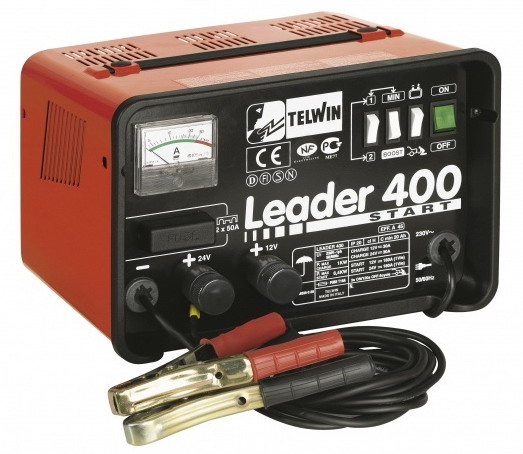 Telwin Leader 400 Start 230V 12-24 V — пуско-зарядное устройство, работающее от сети. Рассчитано на обслуживание свинцовых батарей с жидким электролитом емкостью 25-250 Ач. |