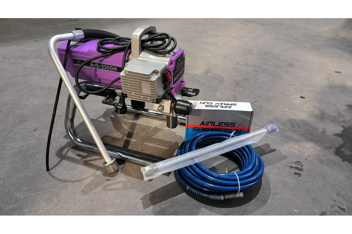Прислали новую установку. Собрали, протянули шланги, манометр, краскопульт, чтобы не сопатил. Первым делом загрунтовали стены. На следующий день покрасили. Красили квартиру часа два, по полу 65 квадратов. Дольше готовили под покраску, целый день. Установкой вполне довольны, качает хорошо, давления хватает с запасом.