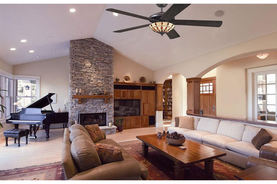 Для освещения в интерьере большой гостиной с высокими потолками (3,2 – 4 м) лучше подобрать люстру с крупными элементами или подвесной светильник с несколькими плафонами.