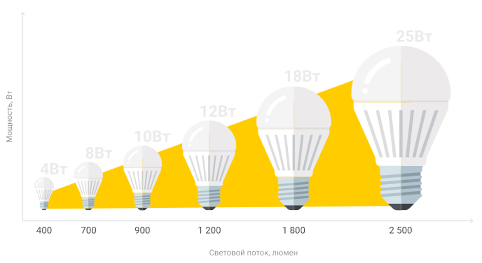 Световой поток и мощность светодиодных ламп напрямую зависят друг от друга: чем выше мощность светодиодной лампы, тем больше света она излучает. Так, лампа мощностью 4 Вт (аналог лампе накаливания мощностью 26 Вт) имеет яркость 300 люменов. Лампа мощностью 8 Вт (аналог лампе накаливания 52 Вт) имеет яркость 580 люменов.