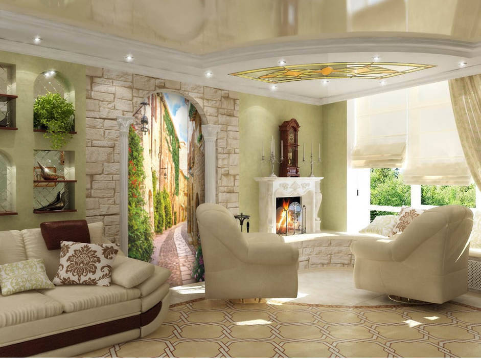 В такой комнате хорошим решением будет разместить точечные светильники по периметру потолка, люстру с одним – тремя плафонами лучше подвесить над обеденным столом, а торшер поставить около дивана.