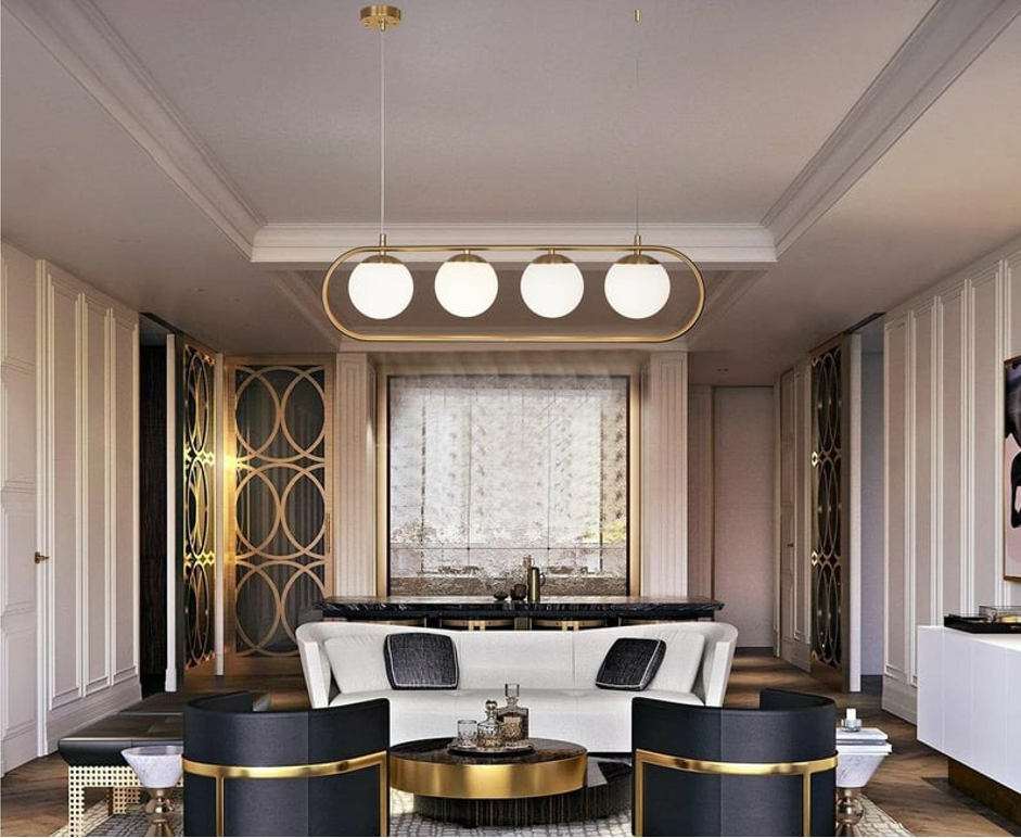 Обычно люстры располагаются в центре гостиной. Если комната совмещена с обеденной или рабочей зоной, подвесной светильник располагают над смысловым центром: обеденным, рабочим или журнальным столом.