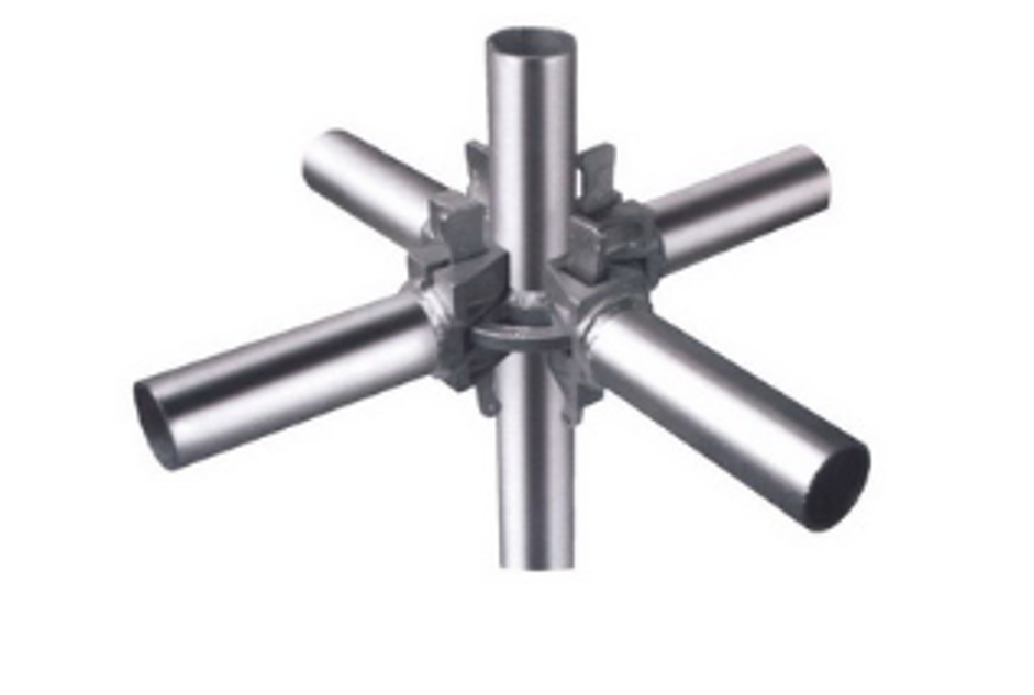 - Особенности конструкции: к вертикальным трубам приварены фланцы с отверстиями. На конце горизонтальной связки есть клиновый замок. Горизонталь стыкуется с вертикалью. В образовавшийся между элементами «тоннель» с помощью кувалды вбивается клин.