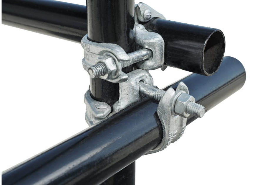 - Особенности конструкции: на вертикальной стойке закреплен хомут, в который продевается горизонтальная стойка. Затем хомут затягивается с помощью отвертки или шуруповерта. Установка хомутовых лесов сложная – каждый элемент нужно закреплять вручную.