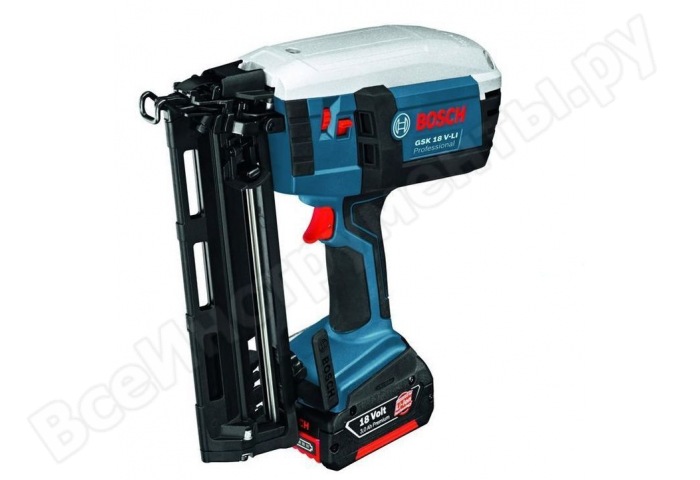 Вид крепежа. Чаще всего гвоздезабиватели и степлеры рассчитаны на оснастку 48 типа, высотой от 6 до 14 мм. Но есть модели техники, предназначенные для крепежа с маленькой ножкой (от 15 до 19 мм) и большой — (от 32 до 63 мм, например, Bosch GSK 18 V-LI 0.601.480.301). Вторые дороже и применяются только профессионалами для установки шифера, досок. Небольшие гвозди используются для монтажа плинтусов, сборки мебели. У скреп эти размеры соответствуют длине. Они могут быть тонкими и толстыми. Первые используются для крепления проводов. Вторые - при работе с тканью и картоном.