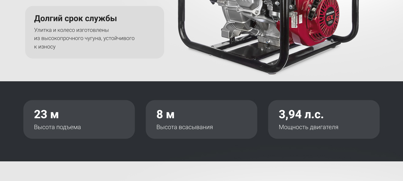 Эффективность 4-тактный двигатель HONDA мощностью в 2.8 л.с. способствует перекачке жидкости на расстояние до 23 м. |