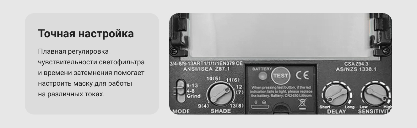 Достоинств много: Максимальный класс светофильтра уровня профи 1/1/1/1 Большое окно, широкий обзор. 4 датчика Высокая скорость срабатывания затемнения. Питается от ОДНОЙ батарейки CR 2450, батарейка ЛЕГКО ЗАМЕНЯЕМАЯ, ничего разбирать и перепаивать для этого не надо. Легкая, на голове почти не чувствуется. 2 диапазона чувствительности, режим шлифовки. Известный бренд.