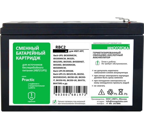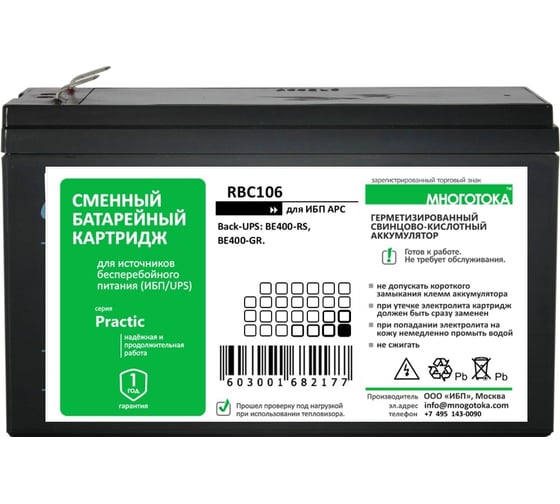 Сменный батарейный картридж для ИБП МНОГОТОКА RBC164 серия Practic - APC: 12 В, 9 Ач, 2.5 кг RBC164 Practic