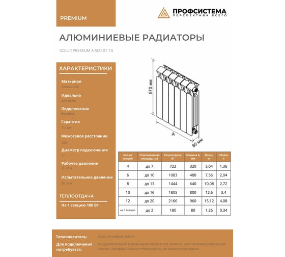 Алюминиевый радиатор VALFEX OPTIMA L Version 2.0 500, 10 секций, 1300 Вт CO-BQ500A/10 L