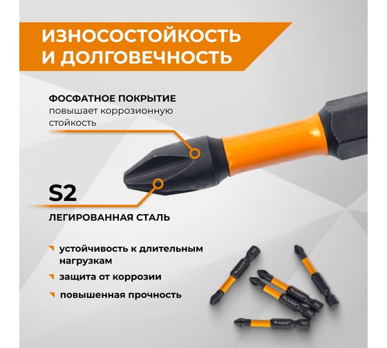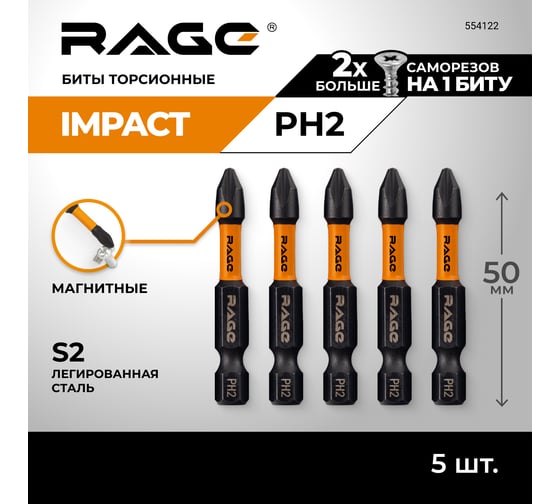 Набор торсионных бит RAGE By VIRA для шуруповерта магнитные IMPACT 5 шт S2 PH2 x 70 мм 554173