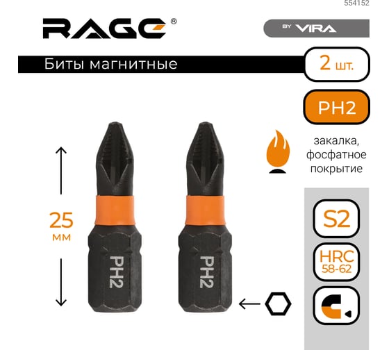 Биты RAGE By VIRA магнитные S2 PH2 х 150 мм 2 шт 554131