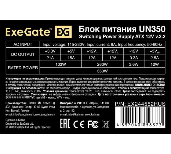Блок питания ExeGate 350W UNS350 ATX, SC, 12cm fan, 24pin, 4pin, 3xSATA, 2xIDE, кабель 220V с защитой от выдергивания 278029