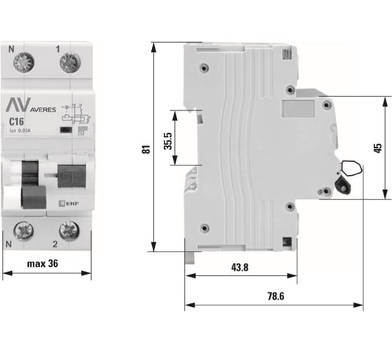 Дифференциальный автомат EKF AVERES DVA-6, 1P+N, 2А, 30мА, 6кА, SQ rcbo*6-1pn-2B-30-ac-av