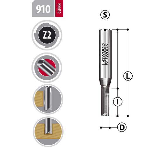 Фреза монолитная пазовая 4х12х51 мм, Z2, s=8 мм WOODWORK 910.0412.08