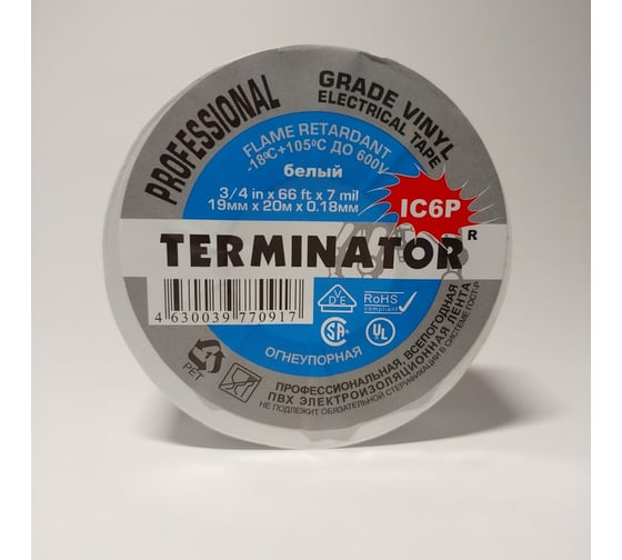 Изолента Terminator Iu1k оранжевая, ПВХ, огнеупорная, всепогодная, 0.18 мм, 19 мм, 20 м 2000823