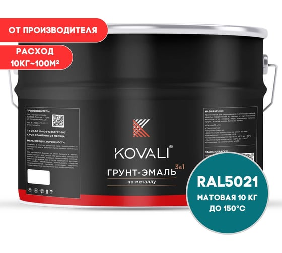 Грунт-эмаль 3 в 1 KOVALI матовая Бирюзово-зеленая RAL 6016 (10кг) kov3.2.6.C.6016.10mat
