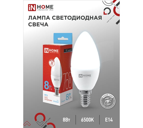 Светодиодная лампа IN HOME LED-СВЕЧА-VC 8Вт 230В Е14 6500К 760Лм 4690612024806
